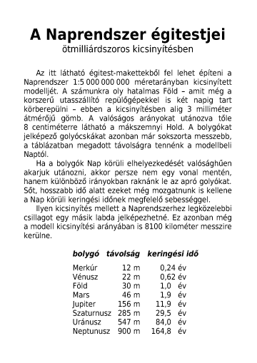 A csillagászati ismeretek szemléltetésének nagy nehézsége, hogy az ábrákon vagy a modellekben akkora méretskálát kellene átfogni, ami méretarányosan igen nehezen, vagy sehogyan sem oldható meg. A Naprendszer esetében az 1:5 000 000 000 méretarány előnye, hogy az egyes égitestek mérete a még látható, de mégis könnyen hordozható tartományba esik. A köztük lévő modellbeli távolságok pedig könnyen elképzelhetők, sőt a Naphoz közelebb keringő bolygókat egy nagyobb teremben, vagy szabad téren el is tudjuk vinni az arányos távolságra. A fenti képre kattintva az nagyobb méretben is megtekinthető.