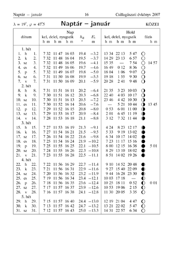 A képre kattintva ugyanaz a PDF állomány jelenik meg, mint az előző kép esetében. Az esti és hajnali égbolt látványát, a bolygók távcsőben megfigyelhető képét, valamint a táblázatos rész többi ábráját szintén Delphi program számolja.