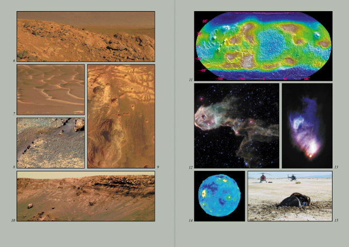 12. Csillagkeletkezés a Cepheus csillagképben. 13. Egy fiatal csillag által megvilágított csillagközi anyagfelhő. 14. Radarmérésekkel készített magassági térkép a Vénusz felszínéről. 15. A Nap részecskesugárzásának vizsgálatára felbocsátott Genesis űrszonda földbe csapódott visszatérő egysége.