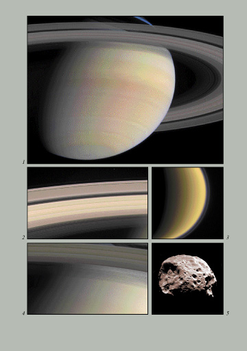 A Cassini űrszonda felvételei a Szaturnuszról (1, 2, 4) valamint a Titan (3) és Phoebe nevű (5) holdjáról.