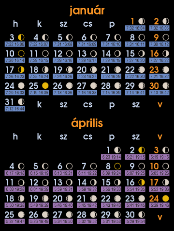 Jobb oldalon, a nagyított részleten látható, hogy ezek a csillagászati naptárak a szokásos adatokon túl tartalmazták a napkelte és napnyugta időpontokat, ezeknek a háttérszíne jelezte a téli illetve nyári időszámítás időszakát. Minden napnál szerepelt a holdfázis alakja is, eltérő színnel kiemelve a fő holdfázisokat (újhold, első negyed, telehold, utolsó negyed). A lapon található kis képekre kattitva megnézheti a teljes méretű posztert is PDF formátumban.