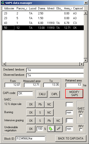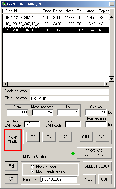 A jobb oldali adatablakban olvashatják a vizsgált mezőgazdasági parcellákhoz tartozó támogatási kérelmek adatait. Itt adják meg az ellenőrzés eredményére vonatkozó részletes információkat, és ezután továbblépnek a következő ellenőrizendő blokkra.