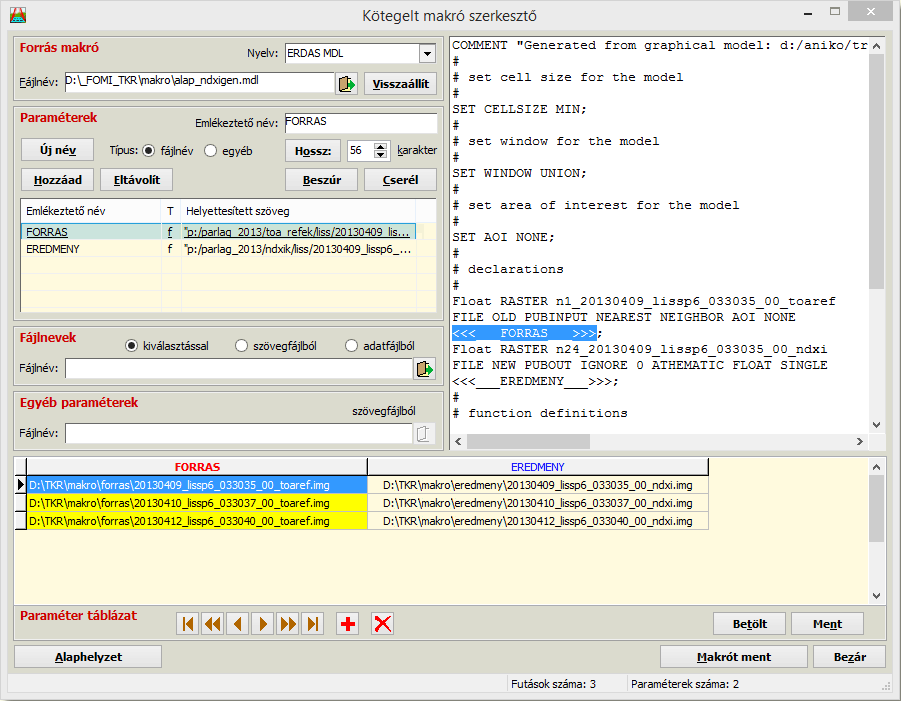 a felhasználó által kiválasztott, ERDAS makrónyelven (MDL) megírt és kipróbált, ASCII text formátumú makró felhasználásával létrehozható egy olyan kötegfájl, ami az ERDAS Modeler programba visszatöltve különböző bemenő paraméterekkel automatikusan lefuttatja a makrót.