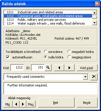 az egyes adatbázis pontok adatainak megtekintésére illetve módosítására szolgál. Az ablak felső részében a felhasználó által nem módosítható,