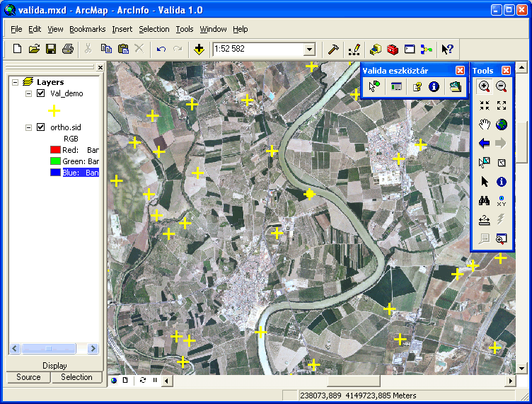 A Valida program munkaképernyője. Egy légifelvétel hátterén sárga keresztek jelzik a pontok helyét, amelyekhez a szakértőnek valamilyen adatot kell beírni. A kijelölt, szerkesztendő pontot a program mindig a képernyő közepére állítja és feltűnően kiemeli.