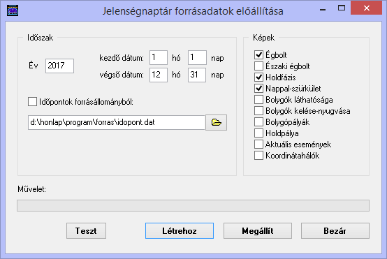 A program kötött formátumú szöveges forrásállományból tetszőleges dátumokra is tud számolni. A Képek keretben lehet kiválasztani, hogy mely képeket készítse el.