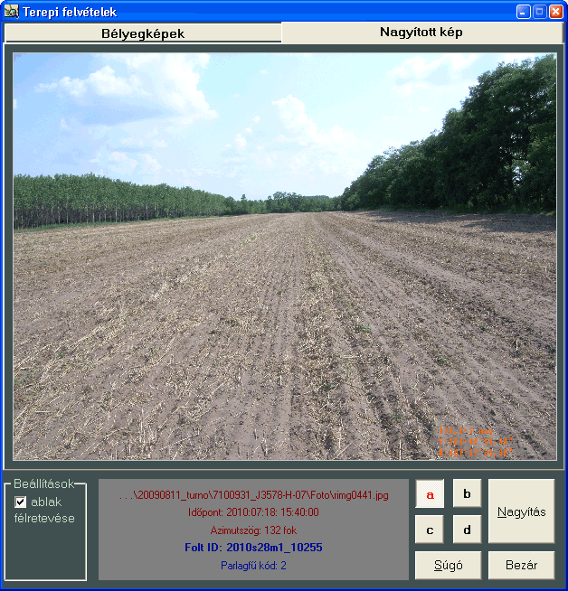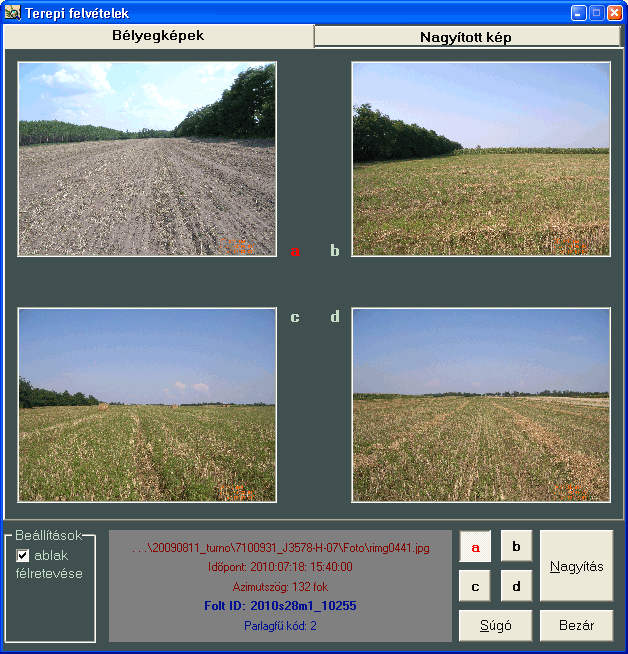 A Bélyegképek lapon az utoljára betöltött, legfeljebb négy darab felvétel jelenik meg kis méretben. A lapok alatt találhatók a program kezelőelemei és az adatok területe. A négy képet a, b, c, d betűk jelölik.