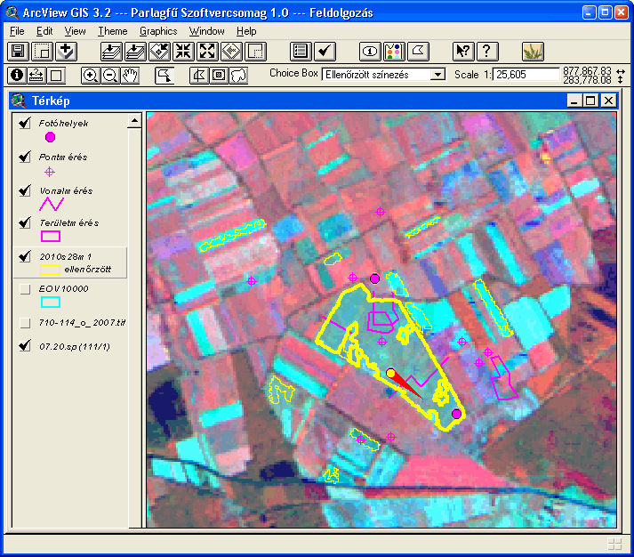 Ha a felhasználó egy ilyen pontra kattint, a pont sárga színűre változik, és körülötte megjelenik egy vörös nyíl, amely a felvétel irányát mutatja. A Terepi felvételek program Bélyegképek lapjára pedig betöltődnek az adott pontban készült fotók.