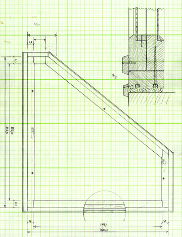 Látható, hogy ez a rajz milliméterpapíron készült. Bár kedvtelésből megtanultam a műszaki rajz alapjait is, de ha saját céljaimra terveztem valamit, szívesebben használtam a milliméterpapírt. Később pedig, amikor már saját számítógépem is volt, a grafikai programokat részesítettem előnyben. A következő képen látható tetőtéri zuhanykabin terve is így készült, hogy a „megrendelő” el tudja képzelni, milyen lesz a kész mű.