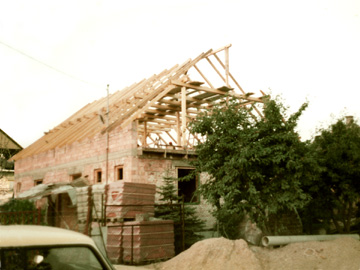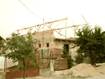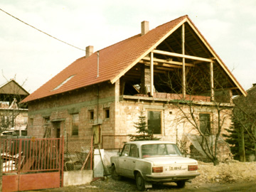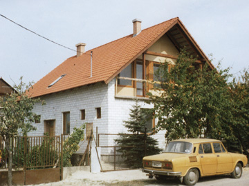 A ház Budapesttől nem messze, egy kis faluban épült. Az építkezés fő szervezője édesapám, Taracsák István volt. Ő készítette a bevezető fekete-fehér képeit és ezt az öt fotót is. A falazást és a vakolást egy ügyes kezű kőművesmester végezte. Ezen kívül csak a gázszerelést bíztuk iparosra. Minden egyéb munkát – az alapozást, a födémeket, a tetőszerkezetet, a tetőtér beépítését, a víz- és villanyszerelést, a burkolást, a festést-mázolást – házilag oldottuk meg, családtagok, barátok és kollégák lelkes segédmunkájával. A szakmunkák többségét én végeztem, persze szigorúan betartva az érvényes műszaki előírásokat. A házilagos kivitelezésnek viszont az volt az ára, hogy a munka évekig tartott, és még a beköltözés után is sokáig folyt.