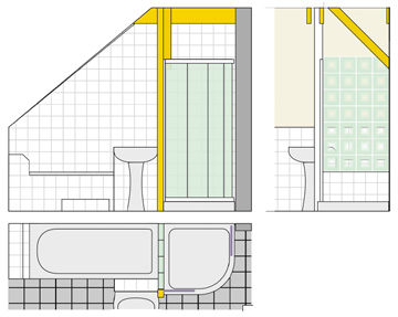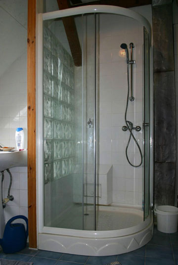 A bemutatott családi ház használata során merült fel az igény, hogy a tetőtérben kialakított fürdőszobában szükség lenne egy zuhanykabinra is. A készen kapható kabinfülke méretei, a rendelkezésre álló szűk hely, a már meglévő vezetékek és berendezések, valamint az ácsszerkezet szándékosan láthatóan hagyott részei igen behatárolták a tervezés lehetőségeit, és több nem szokványos műszaki megoldást is szükségessé tettek. Mindehhez járult még az az igény is, hogy a zuhanykabin világos legyen, ezért a fürdőkád felől üvegtégla fal határolja.