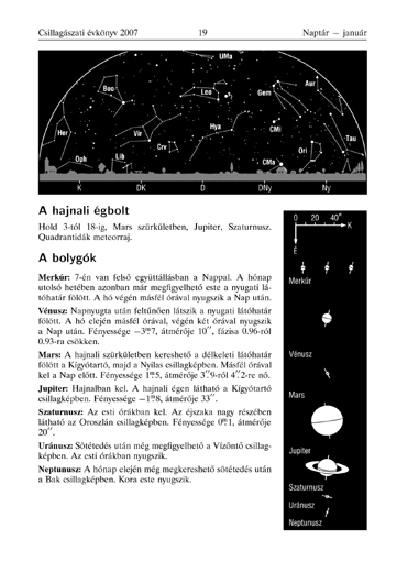 A képre kattintva ugyanaz a PDF állomány jelenik meg, mint az előző kép esetében. Az esti és hajnali égbolt látványát, a bolygók távcsőben megfigyelhető képét, valamint a táblázatos rész többi ábráját szintén Delphi program számolja.