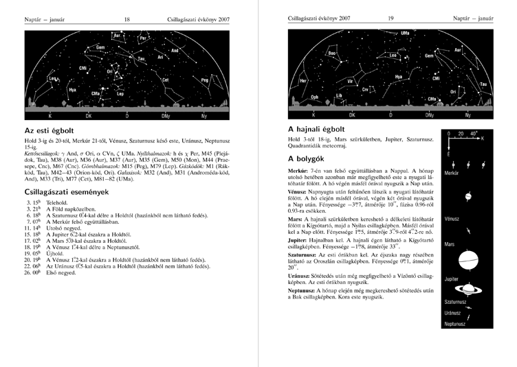 Az évkönyv naptár részének januári képes oldala. A képre kattintva ugyanaz a PDF állomány jelenik meg, mint az előző kép esetében. Az esti és hajnali égbolt látványát, a bolygók távcsőben megfigyelhető képét, valamint a táblázatos rész többi ábráját szintén Delphi program számolja.
