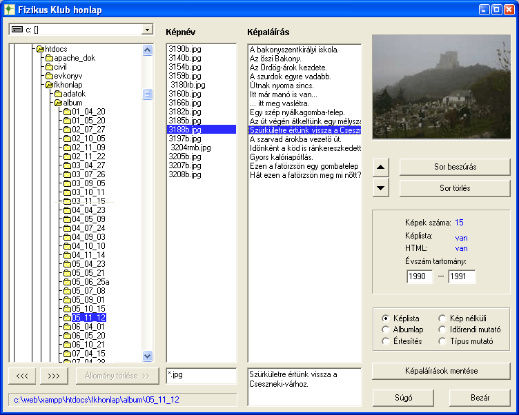 A Fizikus Klub honlap program munkaablaka képlista készítés közben. A bal oldalon a könyvtárszerkezet részlete látható az események dátum szerint rendezett könyvtáraival. A Képnév listában a könyvtárban elhelyezett fényképek neve látható, mellette a Képaláírás listában a megfelelő aláírás szövegek, amiket az alsó szövegmezőben lehet létrehozni illetve módosítani. A kijelölt kép kis méretben meg is jelenik az ablakban.